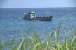 美菲军演期间,一艘运载了“海马斯”高机动火箭炮系统的美国陆军两栖舰在菲律宾巴斯科岛海岸附近。
