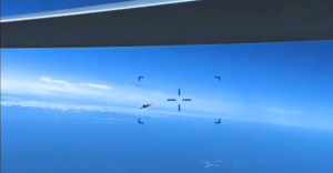 俄军苏-27战斗机靠近美军MQ-9无人机。所以,退一万步说,就算是苏-27SM战斗机真的从后面飞上来撞击了MQ-9A ER无人机,那么必然发生的结果就是:MQ-9A ER无人机的无论哪个部位受到撞击,都是非常可怕的重创,比如V形垂尾肯定会折断,无人机再也无法保持方位以及俯仰上的稳定,会进入到失速螺旋状态,一对大展弦比平直翼在机身的高速旋转过程中会承受不住巨大的气动应力而折断,从MTS-B光电转塔的视角来看就是一幅“天旋地转”的景象。