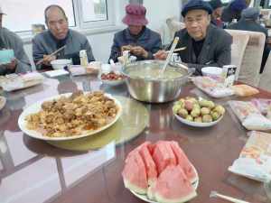 在甘肃省张掖市甘州区乌江镇小湾村互助幸福院内,老人们正在吃饭。新华社发