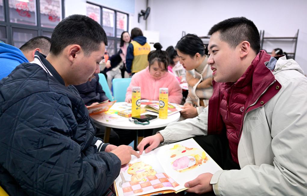 1月26日,在福州市第二社会福利院,志愿者章宇轩(左二)与福利院的年轻人展示制作的新春灯笼和“福”字。