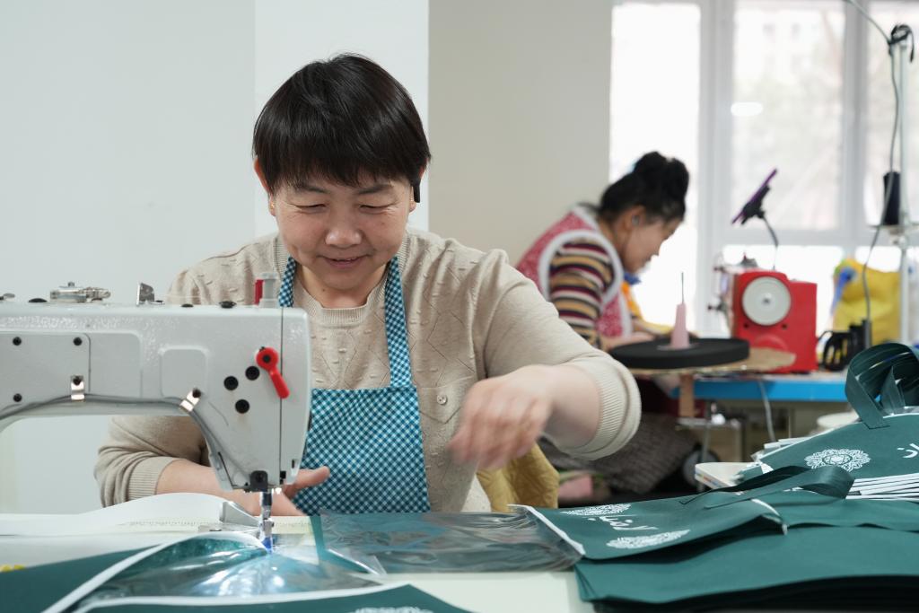 这是3月27日在“雄业创工坊”拍摄的穿着工作服的回迁居民。